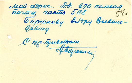 С красноармейским приветом, Александр Степанович! Я к Вам с большой просьбой, которая меняет многое в жизни, в особенности, по той обстановке, в какой приходится быть нам, призванным на защиту Родины. Просьба моя заключается в том, чтобы Вы дали мне рекомендацию о вступлении в ряды Всесоюзной Коммунистической Партии (большевиков). Этот вопрос в моей жизни имеет давнее стремление, но до сих пор я чувствовал себя незрелым, не подготовленным для вступления в партию. Теперь же, находясь в РККА, вопрос о партии, вернее о вступлении в нее, имеет большое значение, углубляя ответственность в порученном деле, дисциплинируя во всем. Почему я обращаюсь к Вам? Да потому, что Вы меня знаете с 1935 года по совместной работе, как говорится, и хорошие и плохие стороны. Рекомендации я смогу получить и во фронтовой обстановке от членов партии нашей части, но, кроме этого, я хочу иметь рекомендации от товарищей, знающих меня давно. Не подведу, Степанович, не сомневайся, нужно будет - по частичкам отдам всю жизнь, но гадом не буду. После призыва меня в РККА учился до февраля месяца и с февраля на фронте, правда, с перерывами отдыха и формирований. Работаю старшим радистом большой радиостанции. Работа проходит неплохо. Здоров, только злости стало больше на проклятых стервецов, нарушивших нашу мирную жизнь, но по характеру своей работы не кокнул еще ни одного гада, хотя на отлично способствуем связью для их уничтожения, имею благодарности от командования и, вообще, наш экипаж на высоком счету у командования. Привет Козину, Мише Бокову, Федорову, Михайлову И.В. и другим знакомым по работе. Мой адрес: Действующая армия, 670 полевая почта, часть №508, Бирюкову Александру Всеволодовичу. С красноармейским приветомНТГИА. Ф.228. Оп.4. Д.234. Лл.58-58а. Подлинник. Рукописный текст.