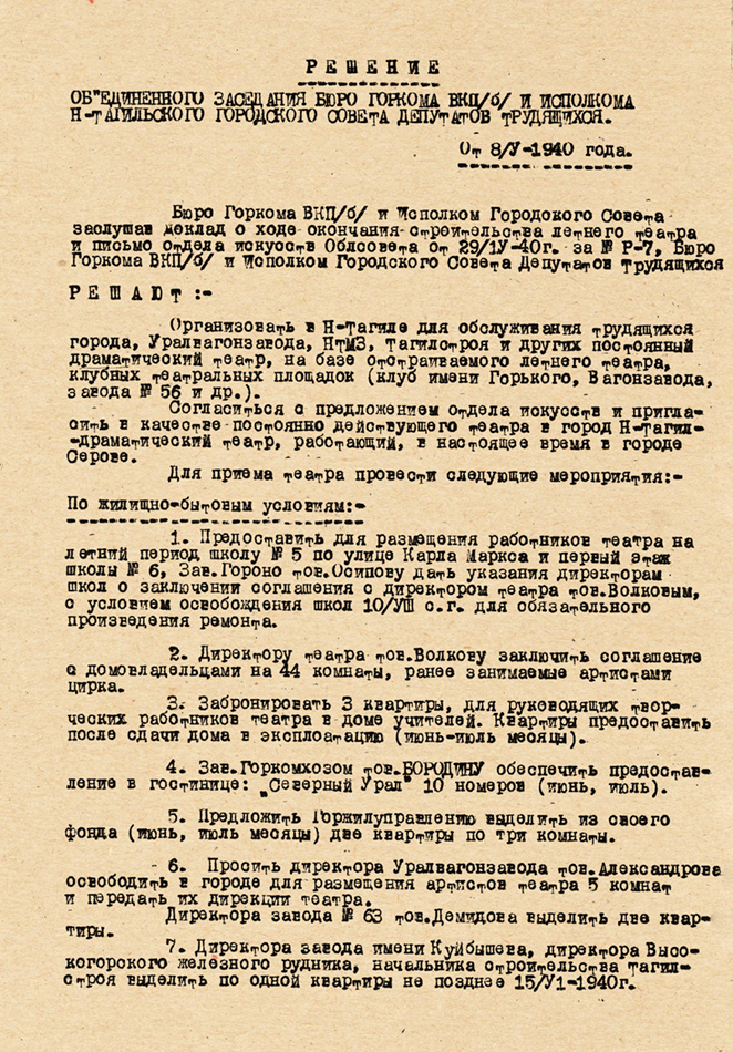 8 мая 1940 года на совместном заседании Бюро городского комитета ВКП(б) и исполнительного комитета Нижнетагильского городского Совета депутатов трудящихся принято решение об организации в Нижнем Тагиле постоянного драматического театра «для обслуживания трудящихся города, Уралвагонзавода, НТМЗ, Тагилстроя и других…». Вновь образованный театр предполагалось разместить на базе отстраиваемого летнего театра, а также на других клубных театральных площадках: им. М. Горького, Уралвагонзавода, завода № 56 и др. В качестве постоянной театральной труппы в Нижний Тагил был приглашен коллектив Серовского драматического театра .