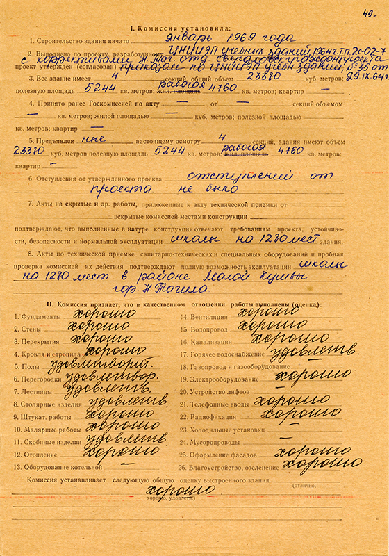Акт приемки в эксплуатацию Государственной приемочной комиссии от 31 августа 1971 года № 26 утвержден решением исполнительного комитета Нижнетагильского городского Совета депутатов трудящихся от 8 сентября 1971 года № 284. (НТГИА. Ф.183.Оп.2.Д.12.Лл.48-49об., Ф.70.Оп.2.Д.1176.Л.260)